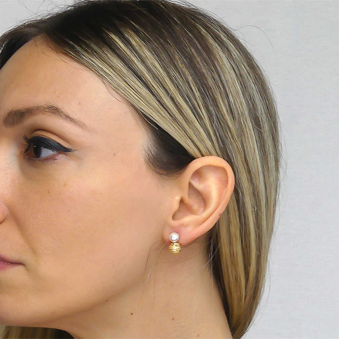 Orecchini a lobo con perla bianca e boule satinata in argento placcato oro giallo.