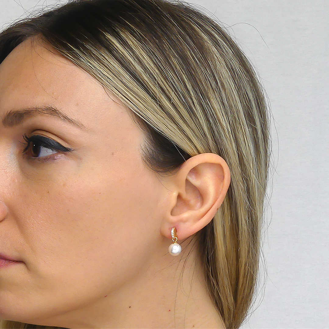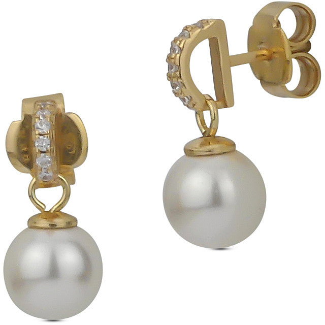 Orecchini in argento placcato oro giallo con perno in zirconi e perla bianca pendente.